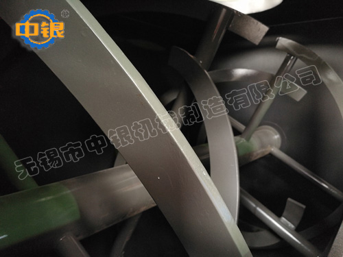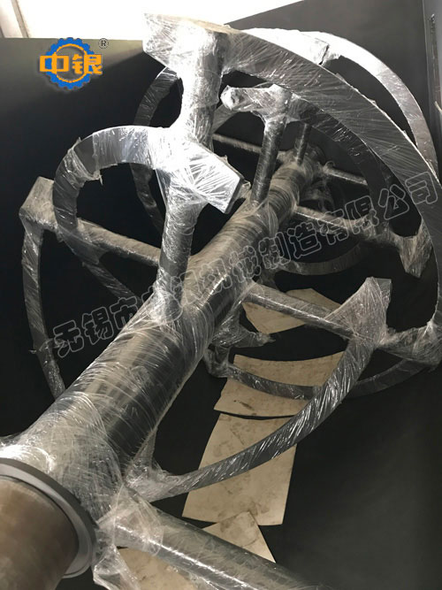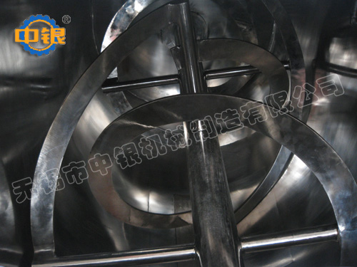 臥式螺帶混合機以高效、快速混合物料、由攪拌軸的螺旋帶運動下,使內(nèi)外螺旋帶在較大范圍內(nèi)翻動物料,內(nèi)螺旋帶將物料向兩側(cè)運動,外螺旋帶將物料由兩側(cè)向內(nèi)運動,使物料來回滲混,另部分物料被螺旋帶推動下,沒軸向徑向運動,從而形成對流循環(huán)。由于上述運動的攪拌,物料在較短時間內(nèi)獲得快速均勻混合。